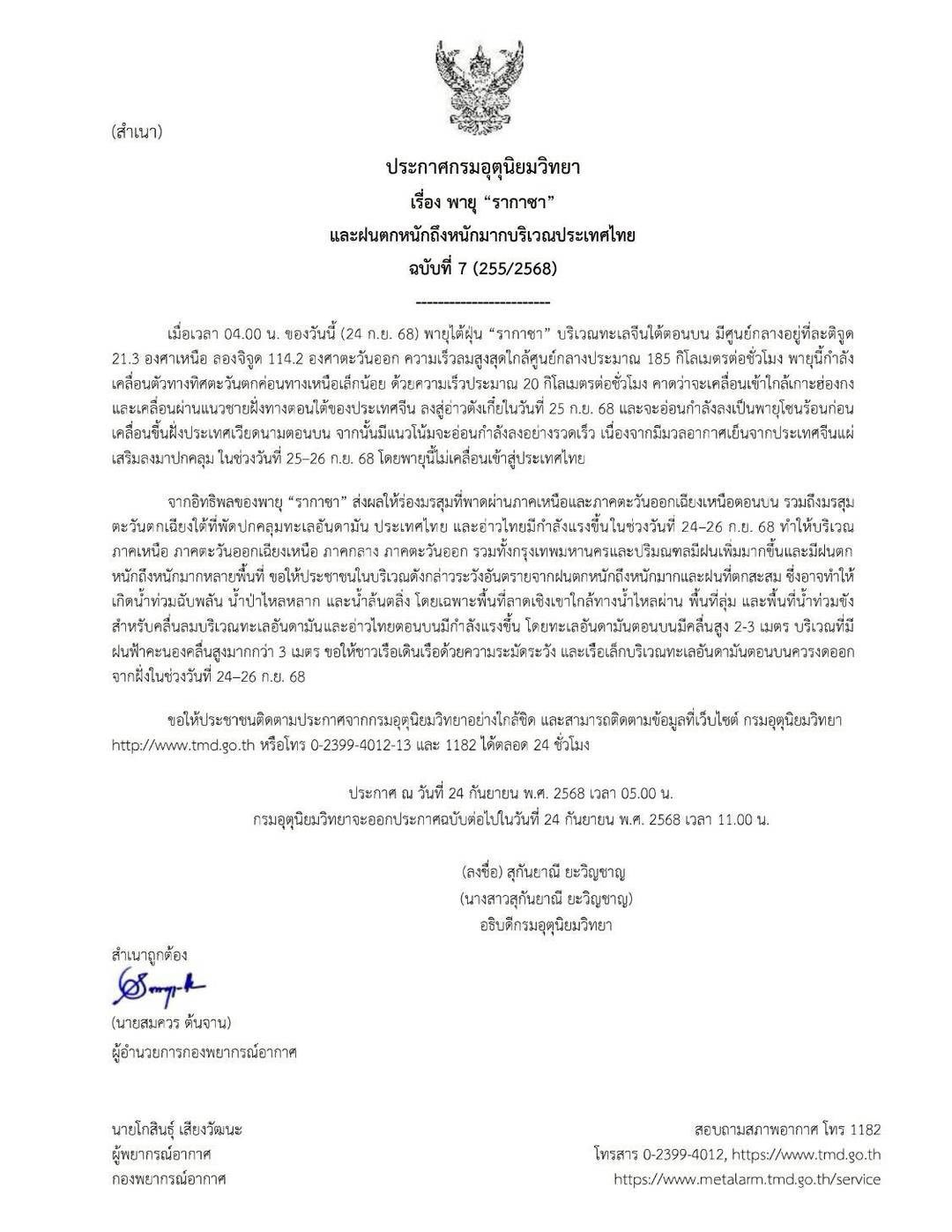 ประกาศกรมอุตุนิยมวิทยา เรื่อง พายุรากาซา และฝนตกหนักถึงหนักมากบริเวณประเทศไทย ฉบับที่ 7 255/2568