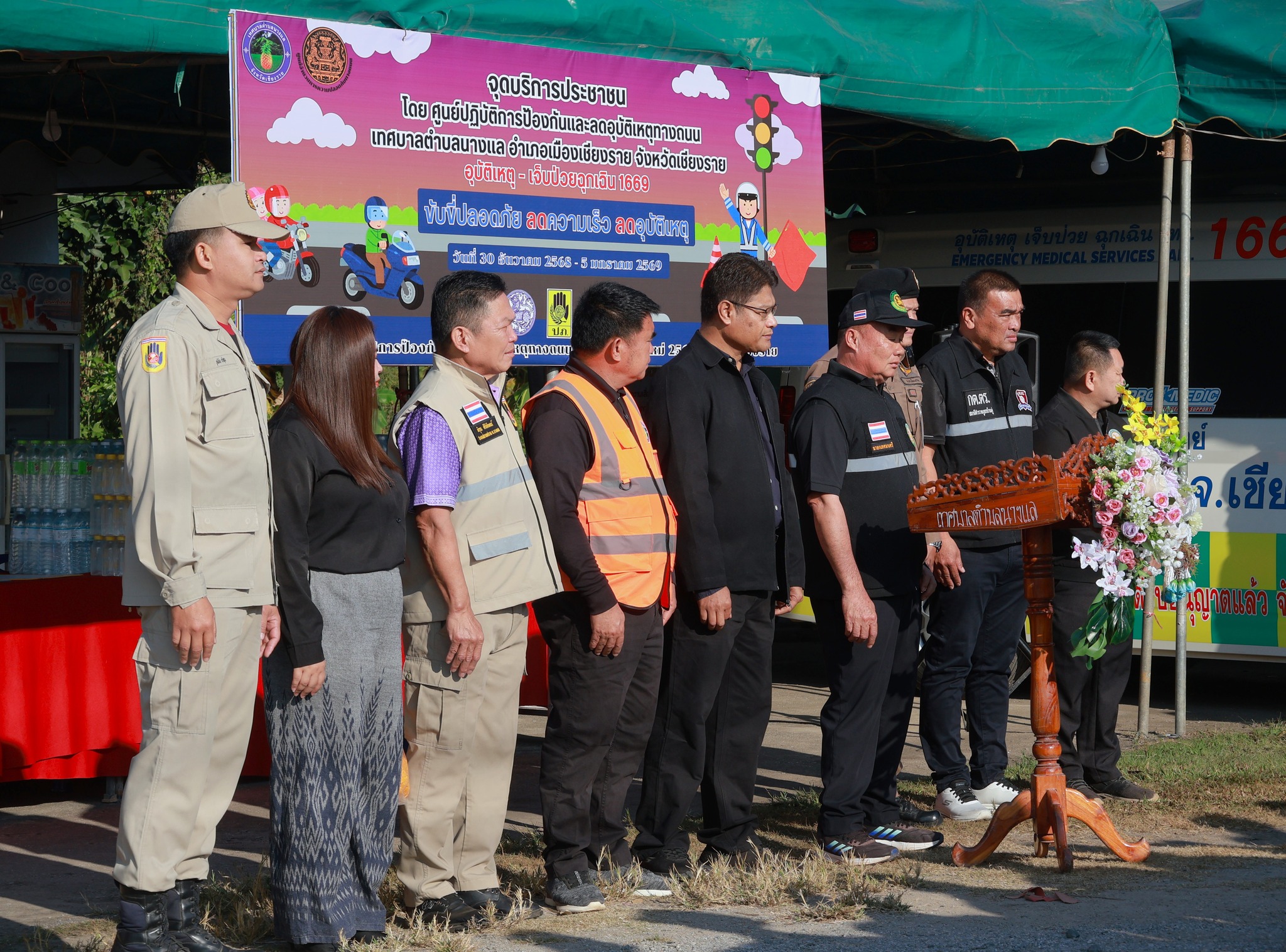 รองศาสตราจารย์ ดร.นาวิน พรมใจสา รองอธิการบดี มหาวิทยาลัยราชภัฏเชียงราย , อาสาสมัครป้องกันภัยฝ่ายพลเรือน , และเจ้าหน้าที่งานป้องกันและบรรเทาสาธารณภัยเทศบาลตำบลนางแล ร่วมการเปิดศูนย์ปฏิบัติการความปลอดภัยทางถนน